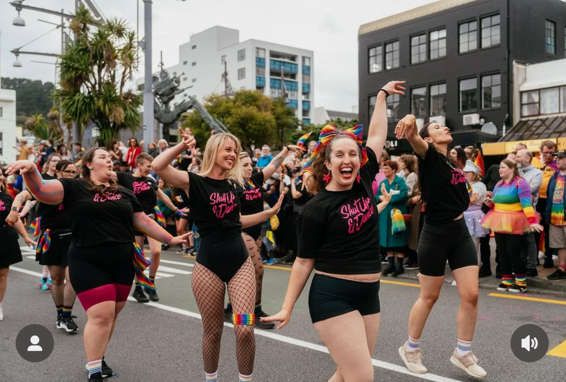 Cars are slowing down past orange traffic cones and people choose to do one of two things; wind down their windows and film us on their phones, or plaster on their poker face. Clearly, leotards and metallic-gold hot pants and sexy men dancing in a pink bird cage on a moving float is clearly just another “classic Welly day” to some people. I spot a familiar face. I haven’t seen them in years. They’re smiling and waving at me and I wave back at them in, jumping in time to the beat.